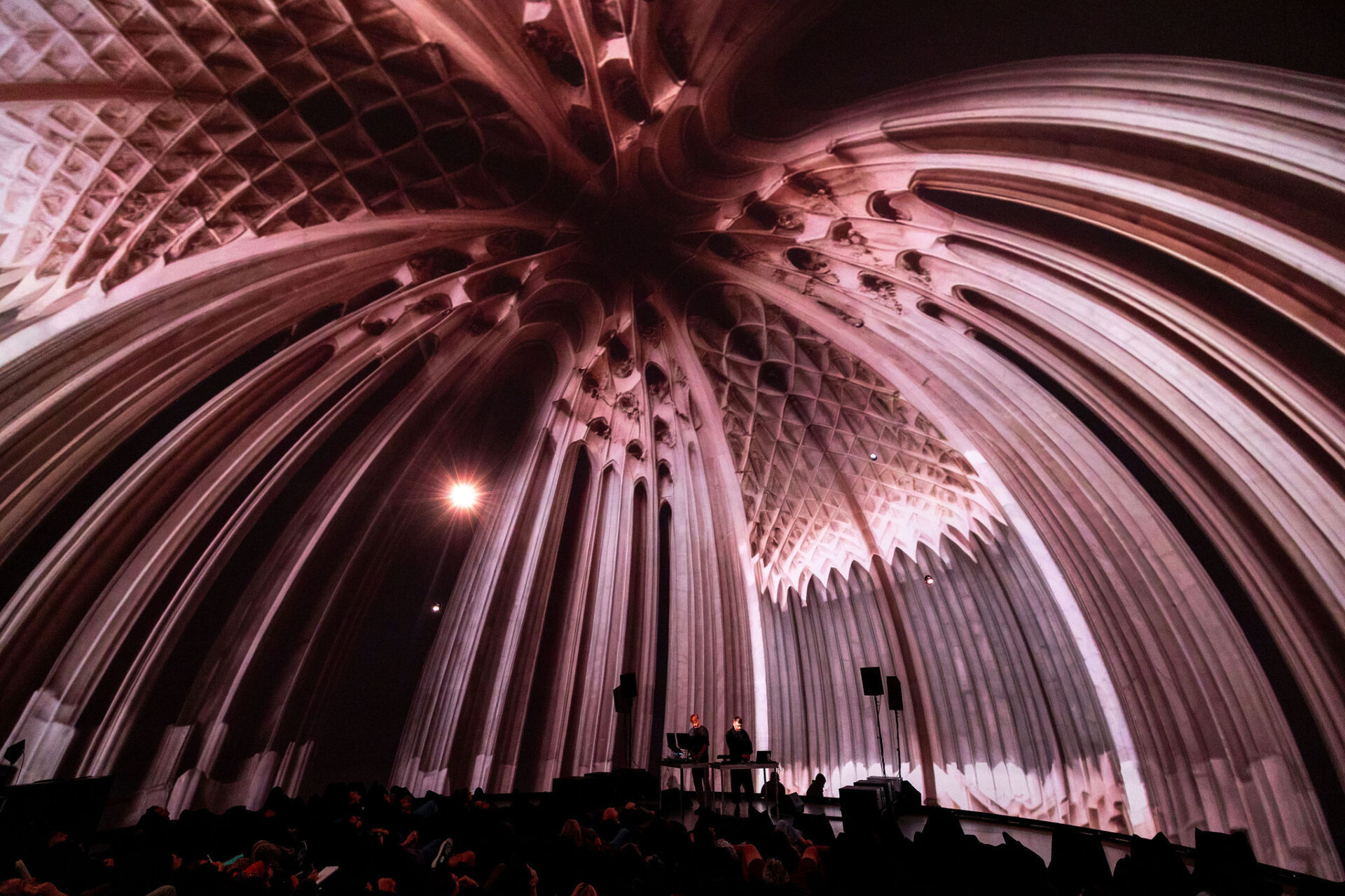 À partir des éléments textuels et visuels recueillis, les artistes juxtaposent des scènes et construisent des architectures 3D complexes, entre créations et IA générative, fusionnant musique et images en direct.